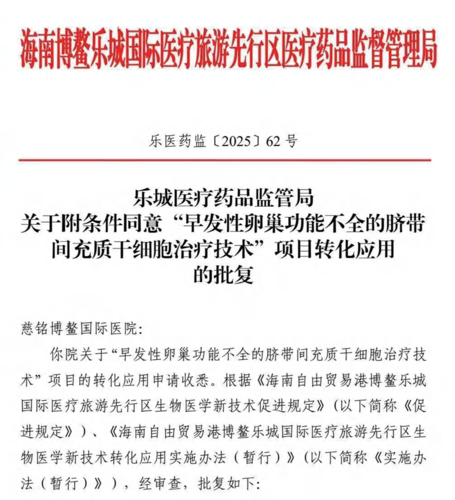 高浓度干细胞直达靶点&综合健康管理 ·卵巢靶向生物创新疗法是我院开展的,已获乐城先 行区药监局批复(乐医药监〔2025〕62号) ·提供营养、运动、生活方式干预等全方位健康方案 ·长期疗效跟踪与反馈,实现长久健康收益